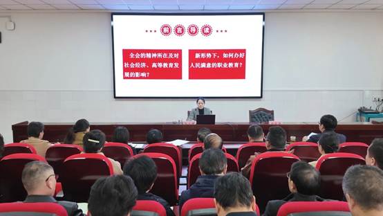 邢淑婕从三个维度引导党员干部深刻领会全会精神内涵:一是全面回顾“十四五”时期发展成绩单,以透过数据、职教、外国人看中国的视角,系统梳理我国在经济发展、科技创新、民生保障等领域取得的重大成就,阐释中国发展对世界的贡献与意义;二是客观分析“十五五”时期我国所处的国际国内环境,结合全会安排部署,明确“十五五”时期经济社会发展的指导方针、主要目标、战略任务与重大举措;三是聚焦高等教育与职业教育发展,深入探讨“十五五”时期高等教育改革方向,剖析职业教育在服务国家战略、助力地方经济发展中的定位与路径,为学校教育教学改革提供理论参考。